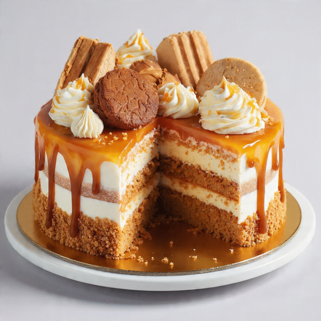 This cake features fluffy vanilla layers, a smooth caramel cream filling, silky whipped frosting, and a shiny caramel drip that looks professional but is surprisingly simple to make at home.