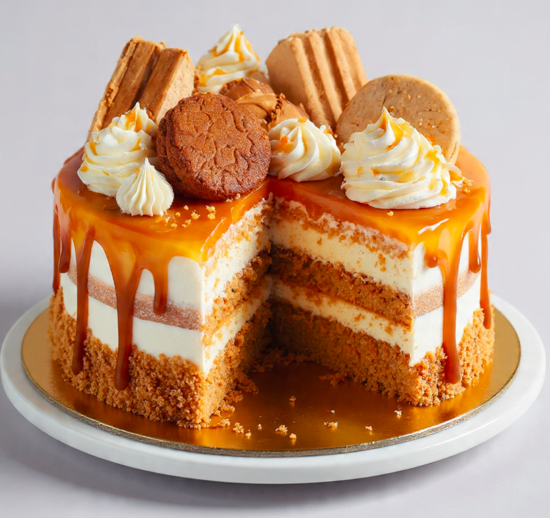 This cake features fluffy vanilla layers, a smooth caramel cream filling, silky whipped frosting, and a shiny caramel drip that looks professional but is surprisingly simple to make at home.