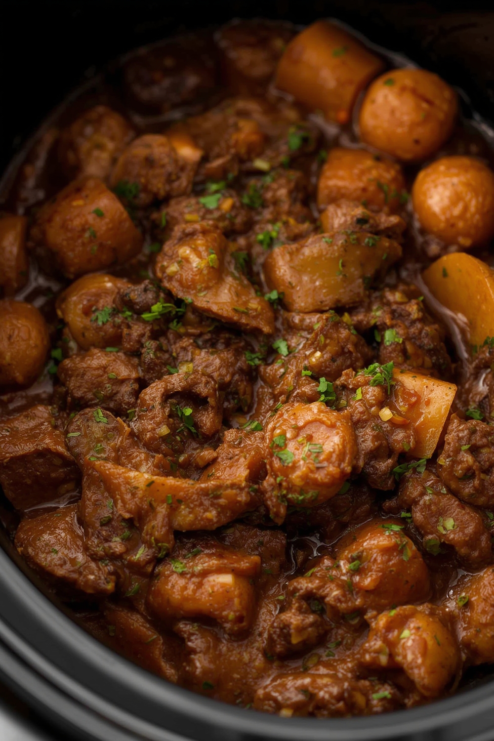 Once the onions and garlic are ready, pour in the beef broth, Worcestershire sauce, and soy sauce. Give it a good stir and scrape any browned bits from the bottom of the skillet—that’s flavor you don’t want to waste! Now, add the sliced carrots, chopped celery, sliced mushrooms, thyme, and rosemary into the slow cooker. Stir again and breathe in the warm, savory aromas. It’s now ready to cook!