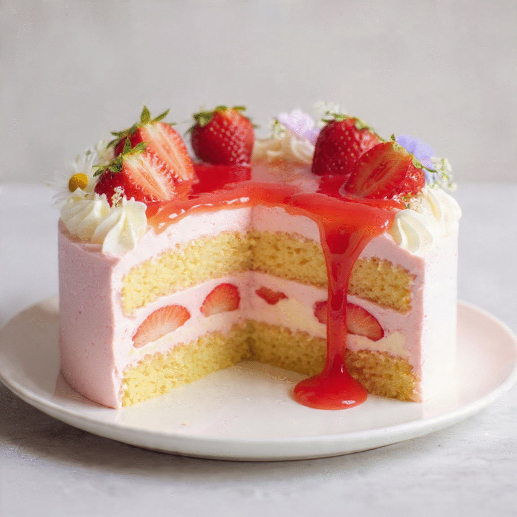 The cake itself is a tender, moist vanilla sponge designed to stay soft and fluffy. Its simple flavor lets the strawberry cream shine.
